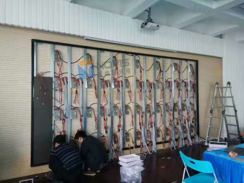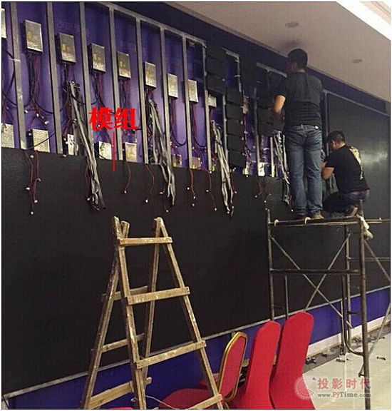 扣好不銹鋼邊后就能開紿上模組了。模組一般從下往上裝,從中間往兩邊開始安裝。這樣的安裝方式有很多爭議,我說明一下我們的想法,從底部安裝主要是為了使水平和垂直都能在正常控制范圍內(nèi),特別是屏幕的面積大了以后,更加容易失控,特別是小間距的要求超高,有點縫隙沒有達到要求,都需要做精細的調(diào)整。安裝過小間距的工程師都知道,即使是精密的模具出來模組或箱體,都還是有誤差的,幾個絲錯位,都會導致整行的錯位。其次,從中間往兩邊安裝可以分成兩組人員甚至四組人員分工干活,節(jié)約安裝時間。即使碰到安裝錯位的問題,基本都不會影響另外一組人員的進度。